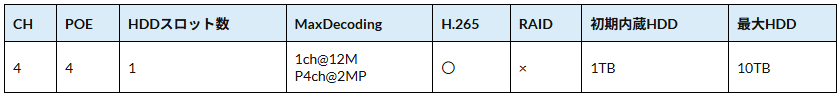 4ch 4POE AI ネットワークビデオレコーダー標準価格(税込)3年保証: ¥123,860(販売価格はお問い合わせください)5年保証: ¥180,675(販売価格はお問い合わせください)外寸/重量:1U:206.6mm×205mm×44.5mm / 936g(HDD を含む)※AI機能搭載(SMD)※マウス, 電源ケーブル, 電源アダプター(53V/1.22A), LAN ケーブル本製品の仕様・外観は予告なく変更されることがあります。